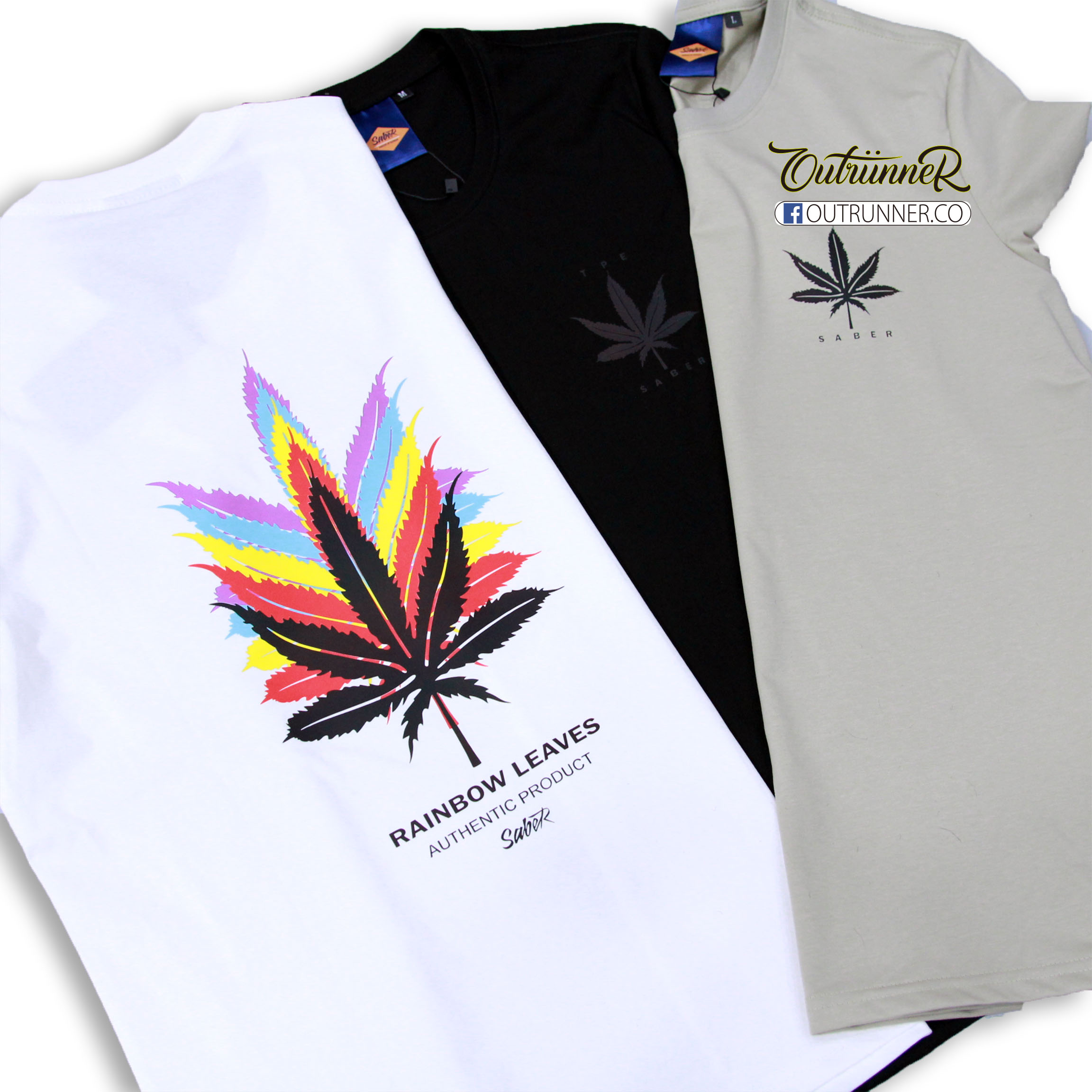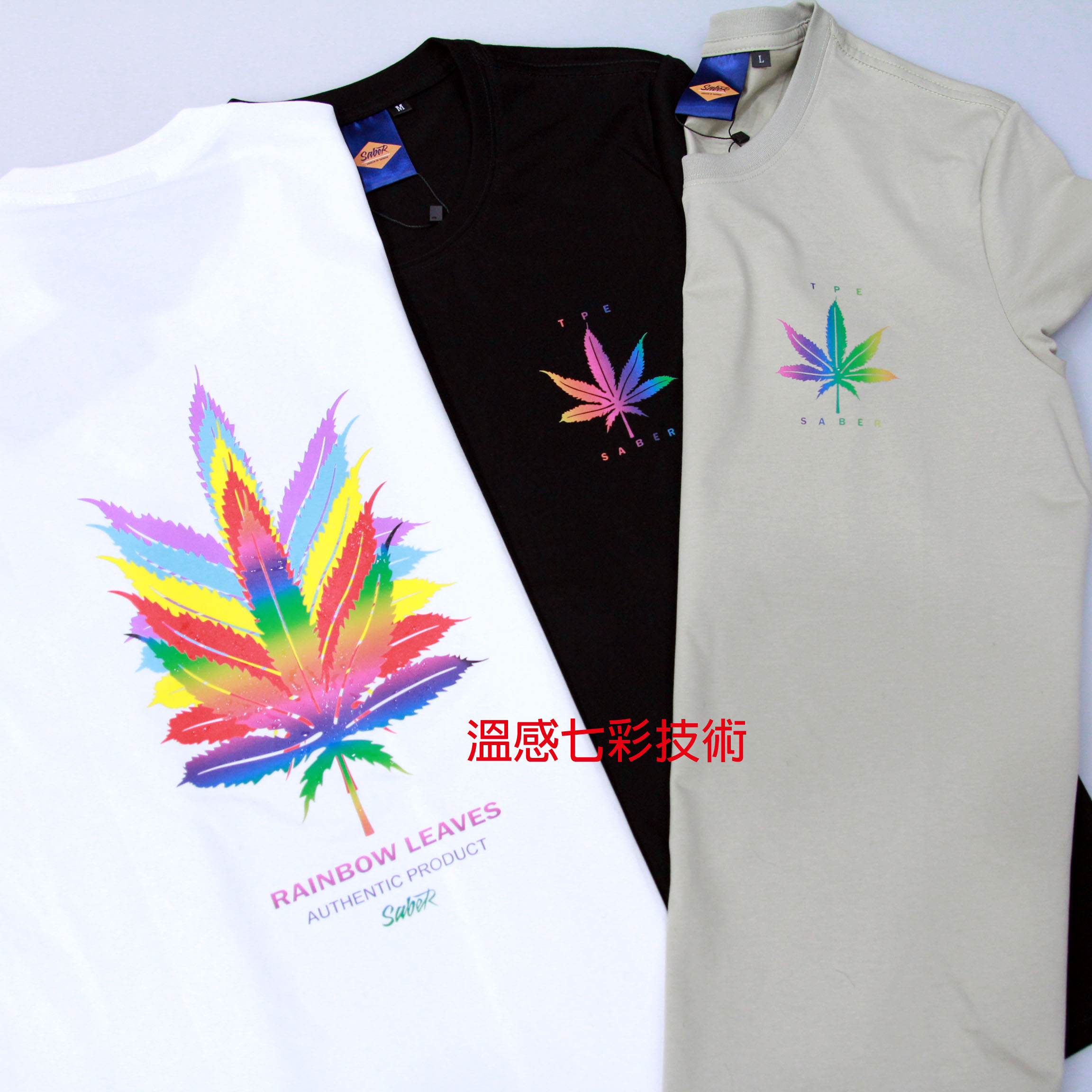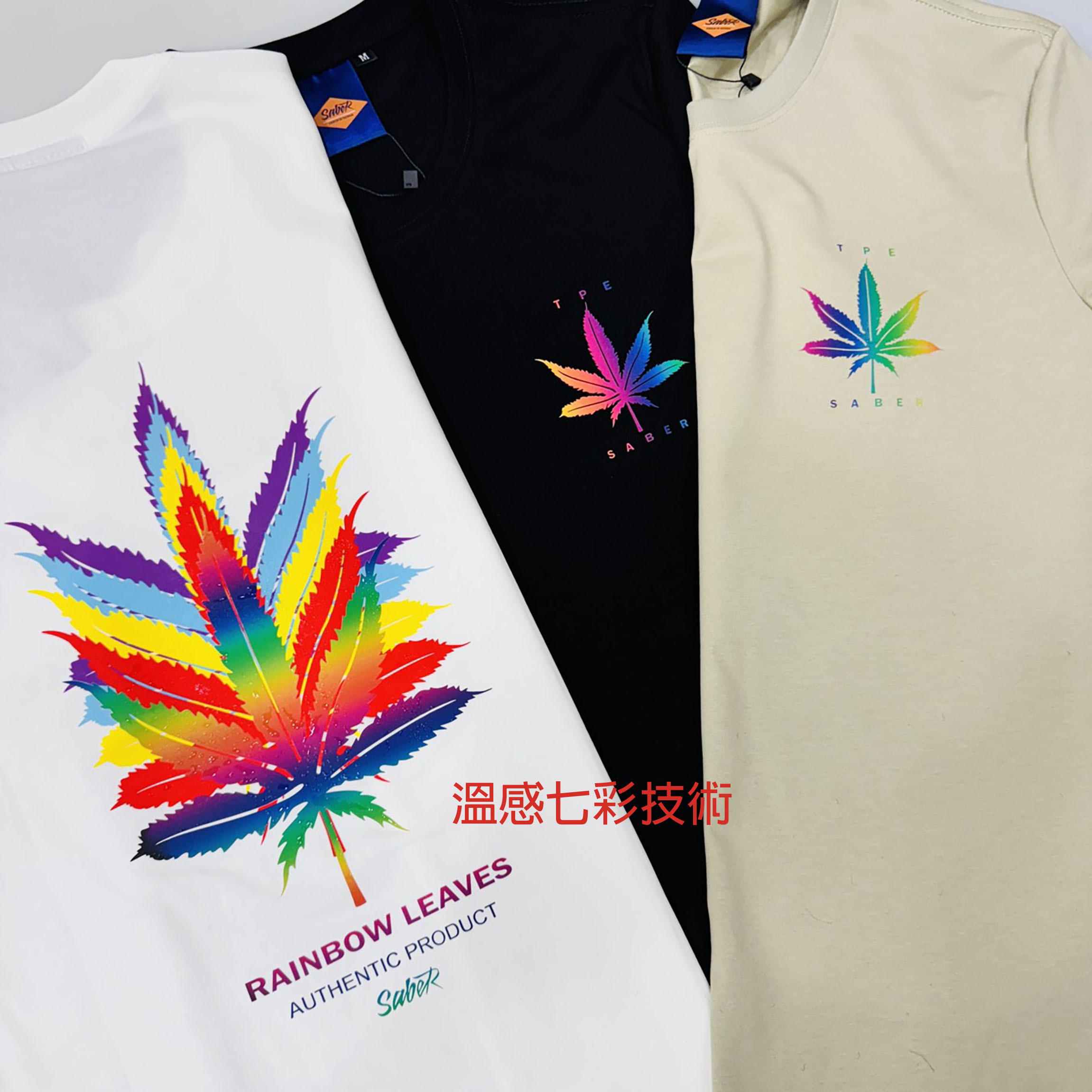 SABER 2025SS SB彩虹大麻葉溫變冰感短TEE,前後幅黑色部份為溫感膠,遇熱後黑色部份會變七彩圖案畫龍點晴,後片高解晰度多套色彩虹燙畫很有特色,今年布料克重升級為180克重,讓穿著更挺拔,更耐穿,耐洗,純棉,不起毛球,手感棉密,舒適,涼爽且富有彈性,男女可穿,不掉色,也不會沾黏,簡約好搭配,很適合台灣炎熱的夏天穿搭。現貨販售中,喜歡的直接下單或來門市穿搭選購.